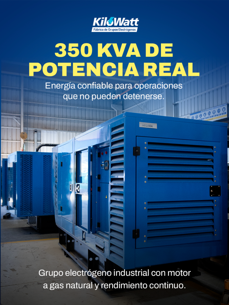 Este grupo electrógeno entrega 350 kVA de potencia real, diseñada para abastecer operaciones que no admiten interrupciones.